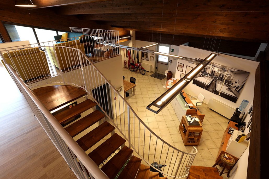 La realizzazione degli uffici dei due titolari sul soppalco è stata l’area progettuale più stimolante e di grande impatto. All’interno degli uffici si trovano le due scrivanie in legno naturale, contornate dalle bellissime poltrone Pulchra in pelle e gli armadi Passepartout di Frezza che incorniciano l’ambiente nella parte più bassa del soffitto.
