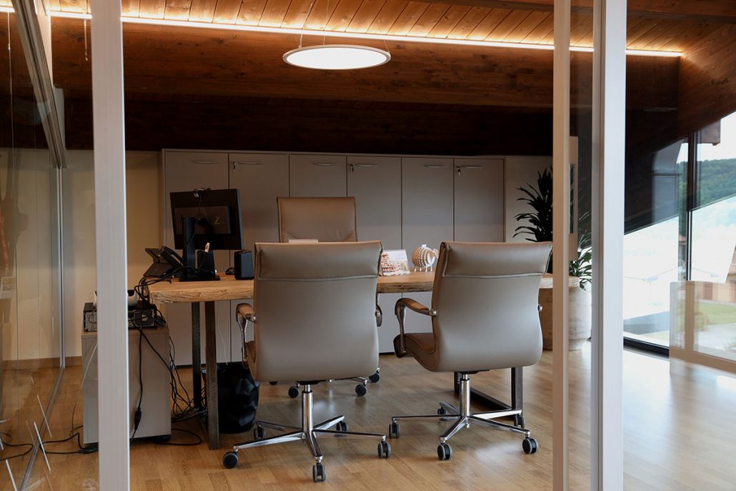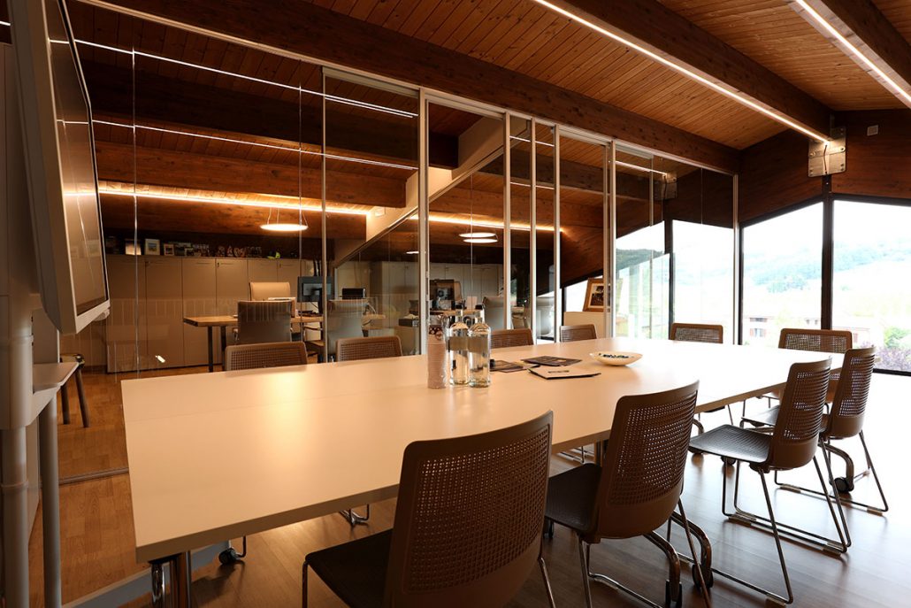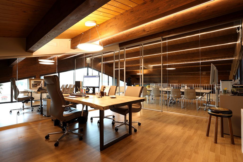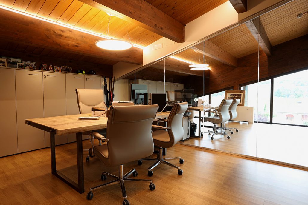 Il soffitto inclinato, con le grandi travi in legno, è l’elemento caratterizzante di questo ambiente per cui è stato necessario creare un setto centrale di parete in cristallo che ha permesso la creazione dei due uffici e la divisione di quest’ultimi dall’area riunione. La parete K35 di Frezza, con il suo profilo minimale e con le ampie porte scorrevoli a tutt’altezza, ha fatto sì che la trasparenza e la leggerezza del cristallo si integrassero perfettamente con il calore e la maestosità del legno, creando un gioco di riflessi, incastri e superfici veramente unico.