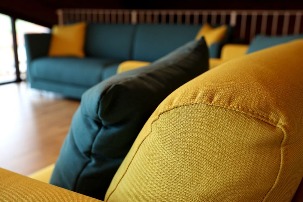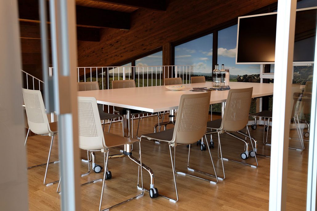 Nella zona di ingresso al soppalco abbiamo creato una sala riunioni polifunzionale, con tavoli ribaltabili e componibili, e con sedute impilabili Ace di Frezza, che conferiscono a questa zona la massima versatilità e funzionalità, oltre a una zona relax/attesa con divani e poltrone Nesis di Milani, in tessuto, con un contrasto cromatico moderno e confortevole.