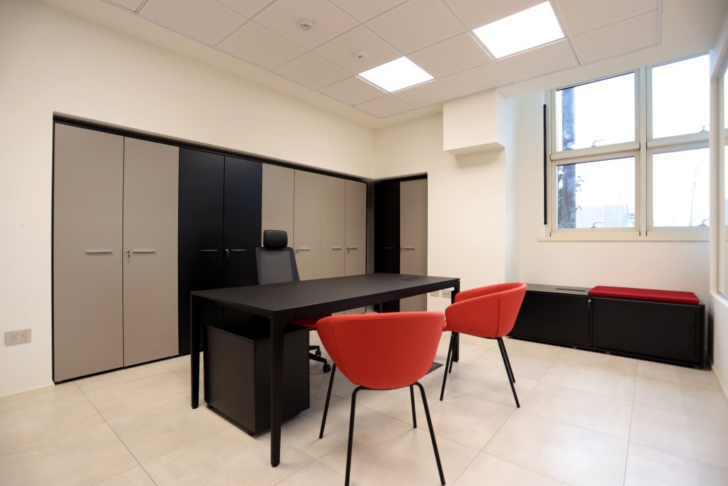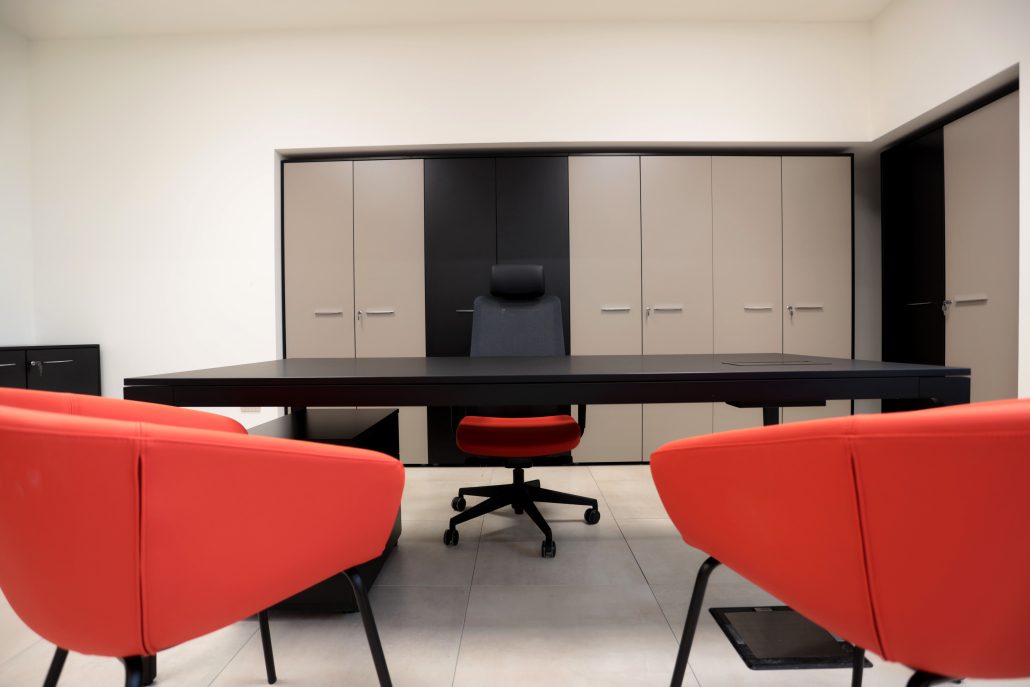 Per l’ufficio del titolare invece l’Alplus di Frezza in Fenix nero e gli armadi nei toni tortora e nero donano eleganza e rendono l’ufficio funzionale ed efficiente, ma allo stesso tempo importante.