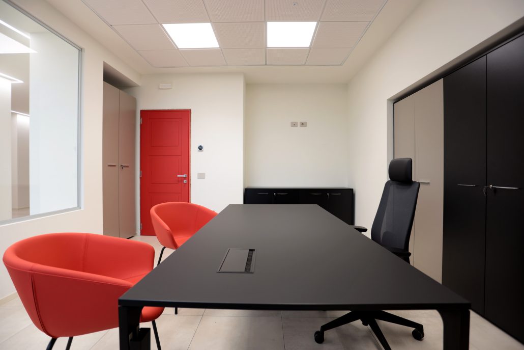 Le poltrone operative sono Bali di Milani, S-mesh per il direzionale con le Stay coordinate e sgabelli Deep di Quinti nei colori coordinati. Le sedute visitatori degli operativi sono le Seed di Milani e nella sala riunioni pozzetti Deep di Quinti con imbottitura interna.