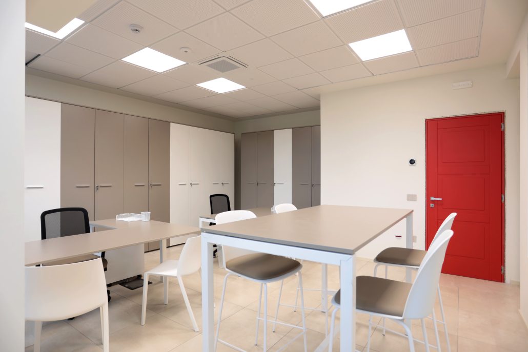 Il cliente, a seguito della realizzazione della nuova sede aveva la necessità di arredare gli spazi di lavoro, uffici e laboratori e la grande sala riunioni al piano primo.