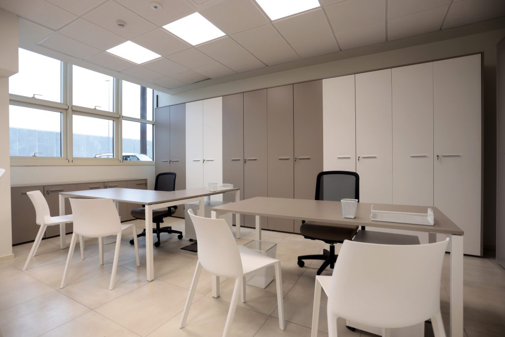 Per gli uffici operativi e amministrativi abbiamo scelto le scrivanie Pop easy di Frezza coordinate agli armadi Passepartout, con un gioco di finiture nei toni chiari del bianco e tortora che si sposavano molto bene all’ambiente e ai pavimenti, donando luminosità e leggerezza. In ogni ufficio abbiamo inserito un tavolo alto con sgabelli per i briefing interni o il ricevimento clienti.