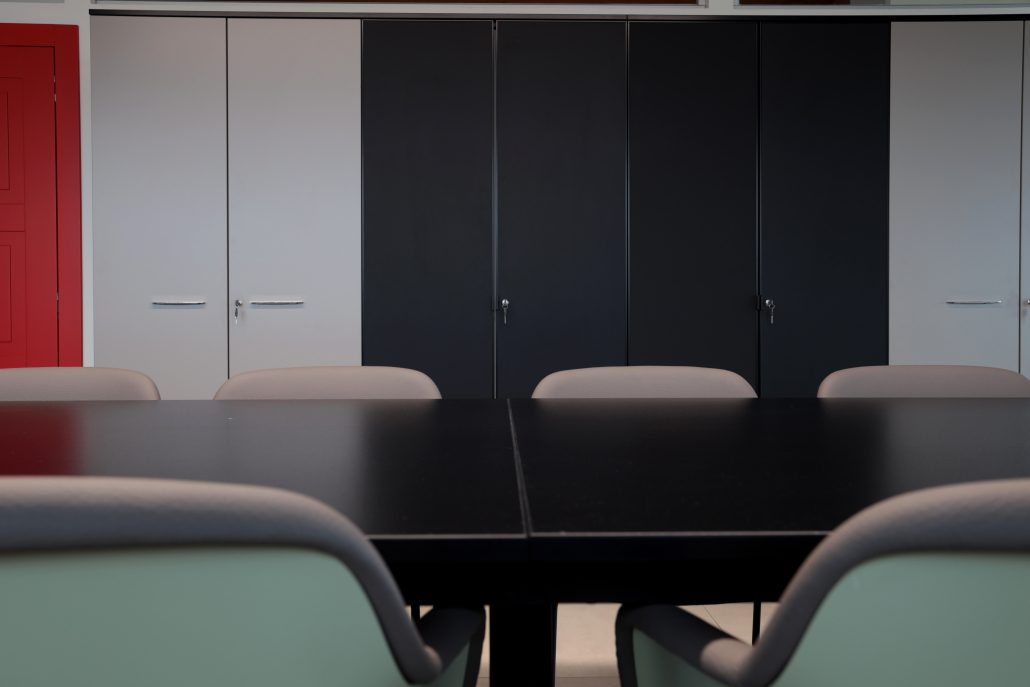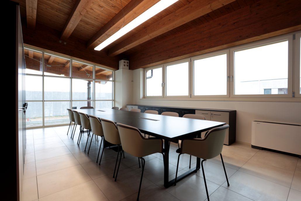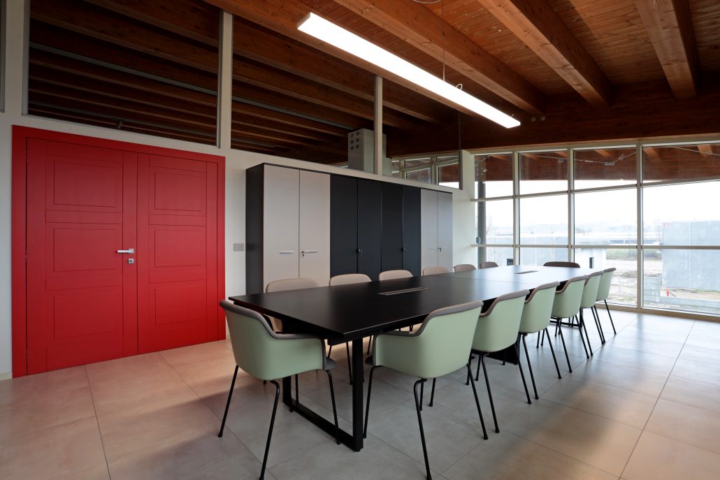 La sala riunioni vede un grande tavolo Be1 di Frezza e gli armadi anch’essi coordinati. In questo ambiente i toni scuri risaltano con le grandi finestrature, le travi a vista e il grande portone rosso.