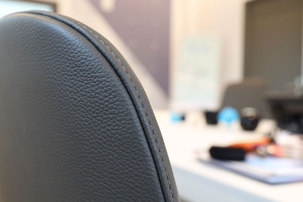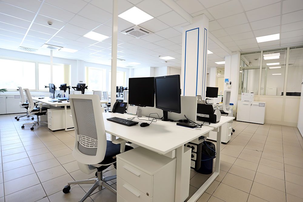 Le poltrone operative sono le Lex di Milani dalla linea elegante e essenziali, configurate con plastiche bianche e schienale in rete grigio chiaro. Sono sedute operative certificate, con molteplici regolazioni ergonomiche, per offrire massimo comfort agli operatori.