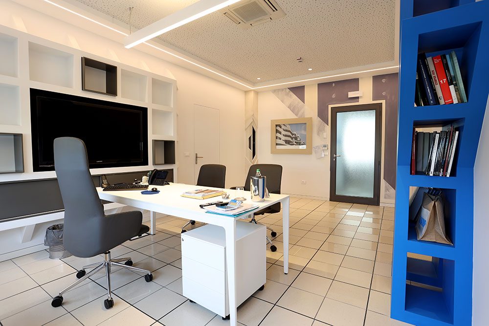Abbiamo subito pensato alla linea Alplus di Frezza, sia per la scrivania del direttore che per il tavolo riunioni. Una linea dal design elegante e minimale, con il piano in Fenix bianco e la struttura in metallo bianca, che si è integrata perfettamente con l’ambiente espositivo e funzionale. Gli armadi sono tutti bassi con ante vetro, e per rifinire la libreria in cartongesso abbiamo realizzato cubi e ante fatte su misura.