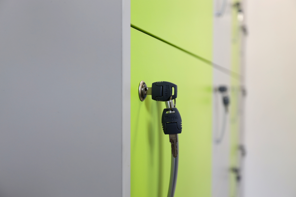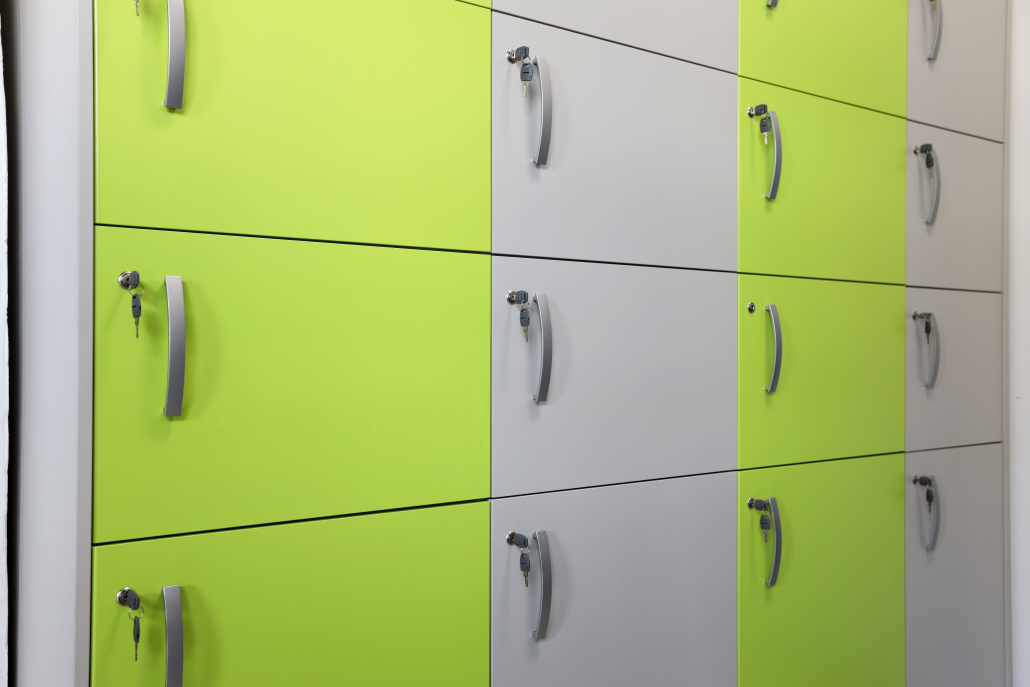 Ci sono stati richiesti dei casellari espositivi di ingresso adibiti al deposito di effetti personali dei visitatori. I casellari dovevano avere varie dimensioni per ospitare anche borse più grandi o valigie per i visitatori che avessero i bagagli al seguito, così abbiamo optato per una soluzione di Colombini con ante multicolor verde cedro/grigio alternate che donano alla composizione freschezza e movimento.
