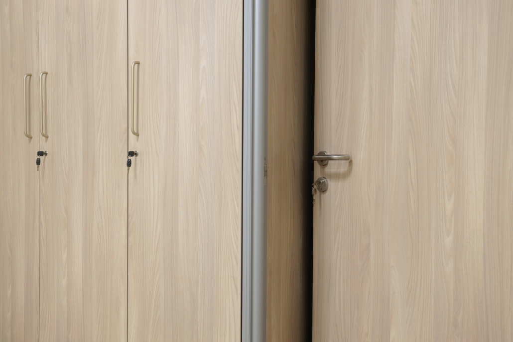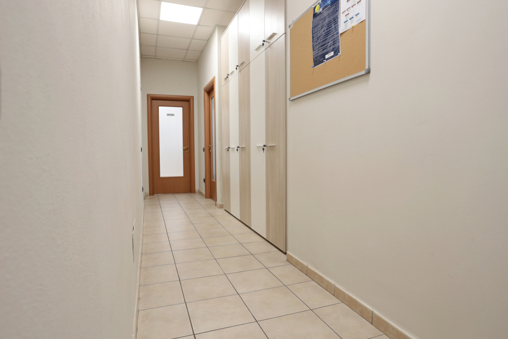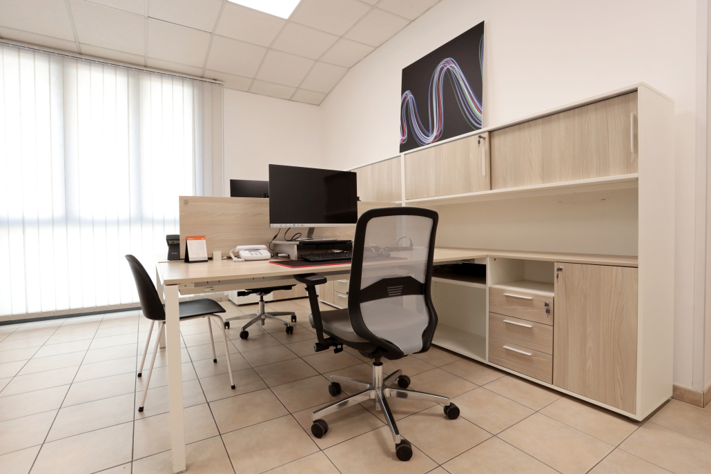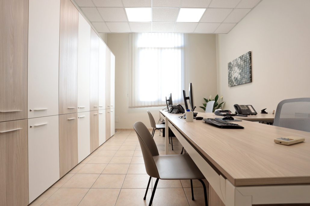 Per gli uffici contabilità e amministrazione abbiamo scelto le scrivanie Pop easy di Frezza coordinate agli armadi Passepartout, con un gioco di finiture nei toni chiari del bianco e dell’olmo che si sposavano molto bene alle pareti e ai pavimenti.