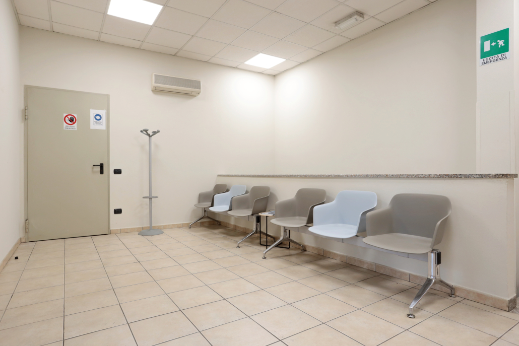 Nella zona corridoio abbiamo suddiviso lo spazio con la parete divisoria Areaplan Spazio di Frezza in finitura legno coordinata agli arredi, e la sala attesa con panche Deep di Quinti Sedute.