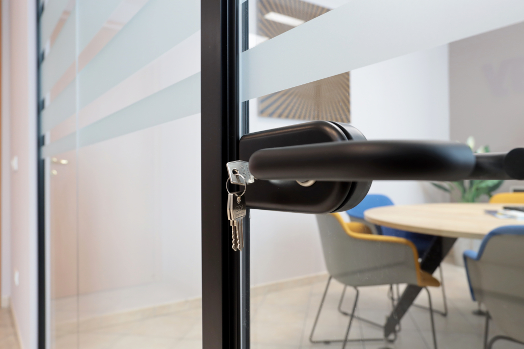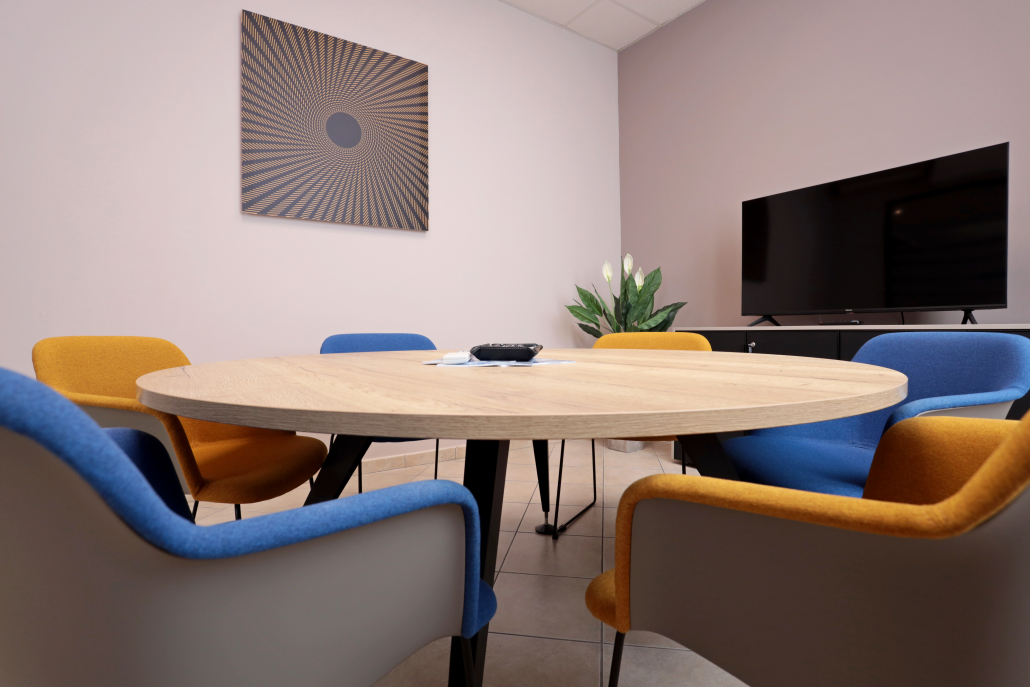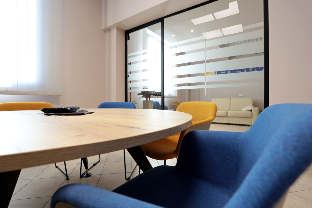 L’area della sala riunioni invece è stata realizzata con le pareti K35 di Frezza con vetro trasparente e profilo nero e l’interno della sala riunioni con tavolo riunioni circolare di Sedus in finitura Likewood e poltrone Deep di Quinti nei colori aziendali. Nella saletta attesa della zona riunioni la decorazione murale è stata fatta con il Logo Aziendale in forex installato a rilievo sulla parete.