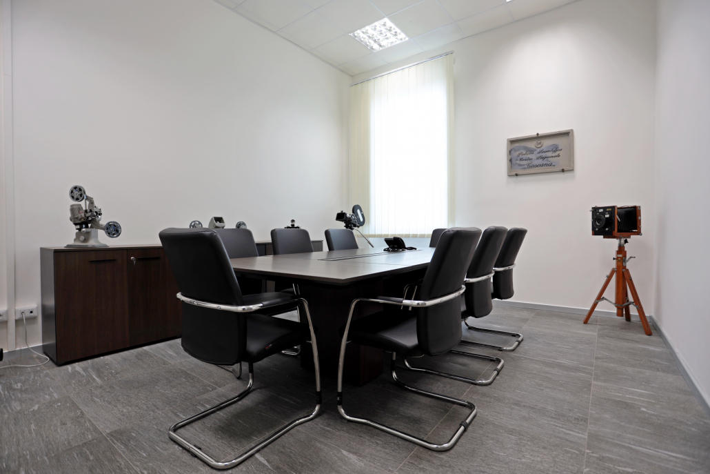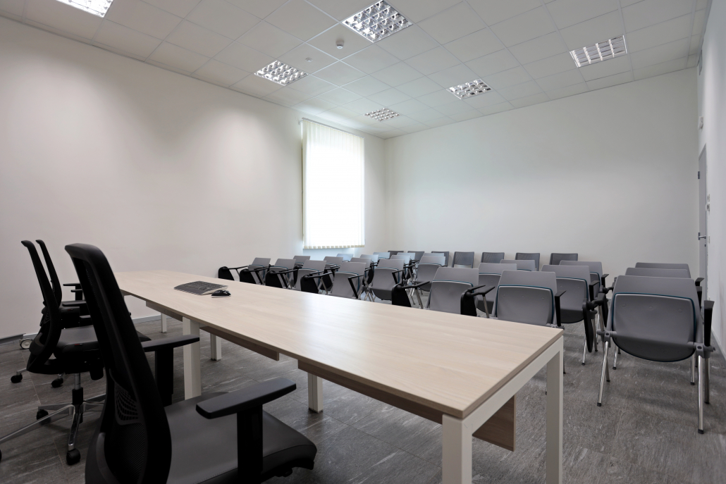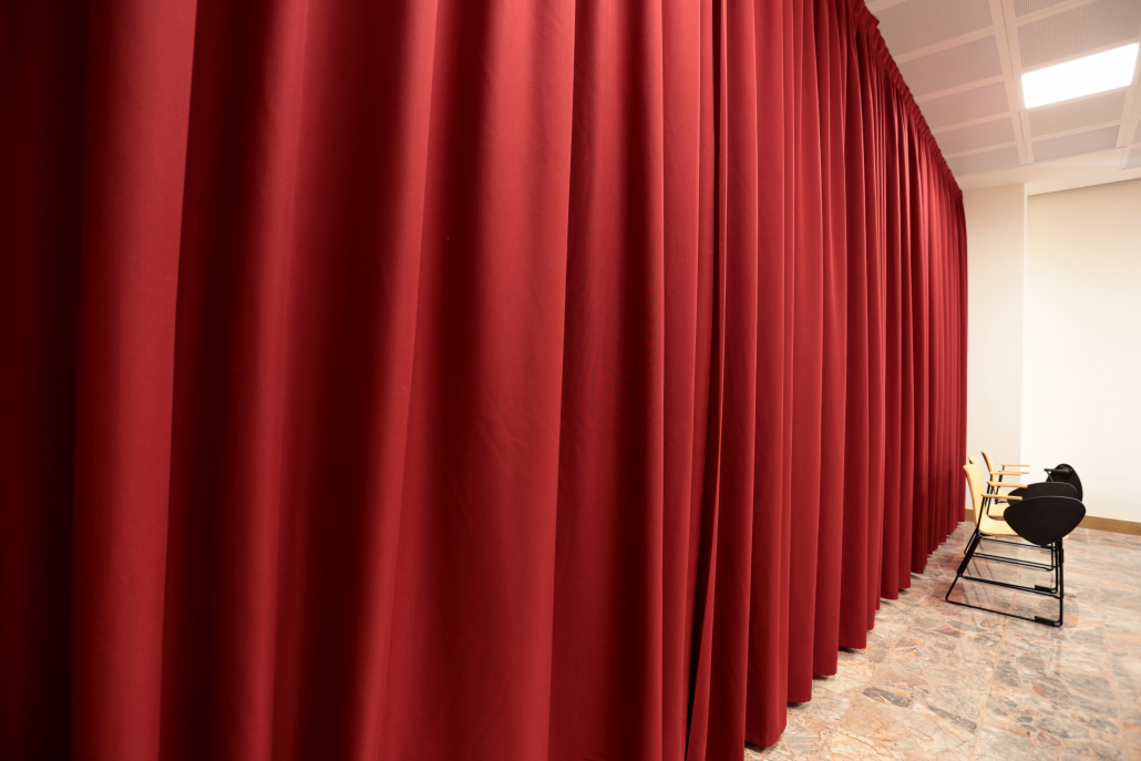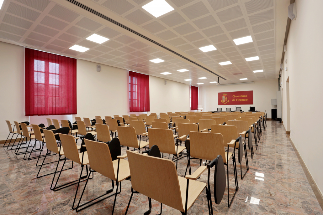 La sala Corsi e Conferenza della Questura è una sala molto grande con pavimento in marmo e soffitti molto alti. Per integrarci in questo ambiente abbiamo scelto le sedute Yo di Frezza il legno chiaro, nella versione con tavoletta portablocco. I tavoli oratore sono Be1 di Frezza molto leggeri e minimali. La grande tenda rossa a sipario di Medit Silentgliss ha una doppia funzione, è un elemento fonoassorbente e anche divisorio per schermare la zona guardaroba.