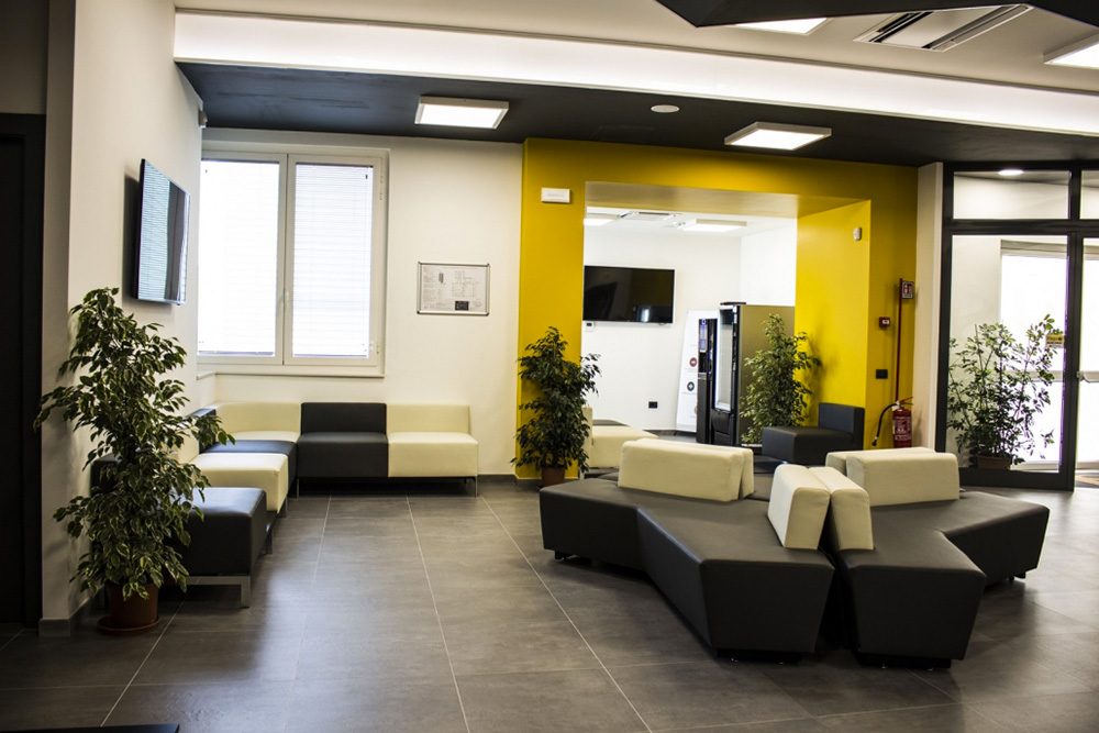 La zona hall e attesa è arredata con sedute Quinti, dove la lavorazione artigianale dei divani e dei rivestimenti ha fatto la differenza insieme alla cura dei dettagli e delle rifiniture.