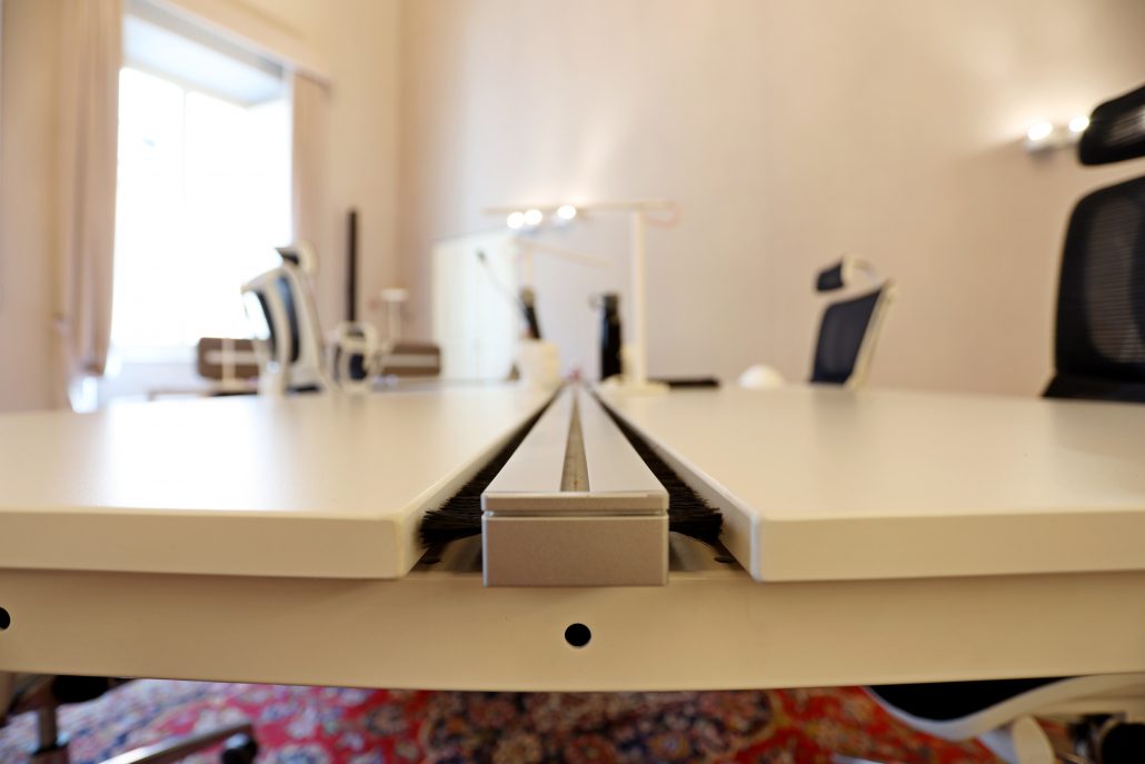 Le postazioni composte da tavoli con struttura a cavalletto e piano in melaminico con angoli arrotondati sono stati accessoriati con tutti gli optional funzionali, dallo sliding top agli schermi fonoassorbenti, agli accessori per il cablaggio. Tutto curato nei minimi particolari e dettagli anche estetici.